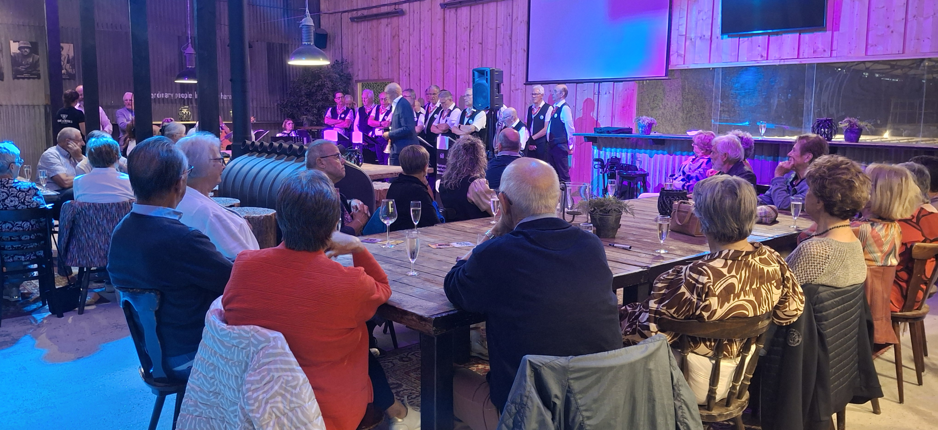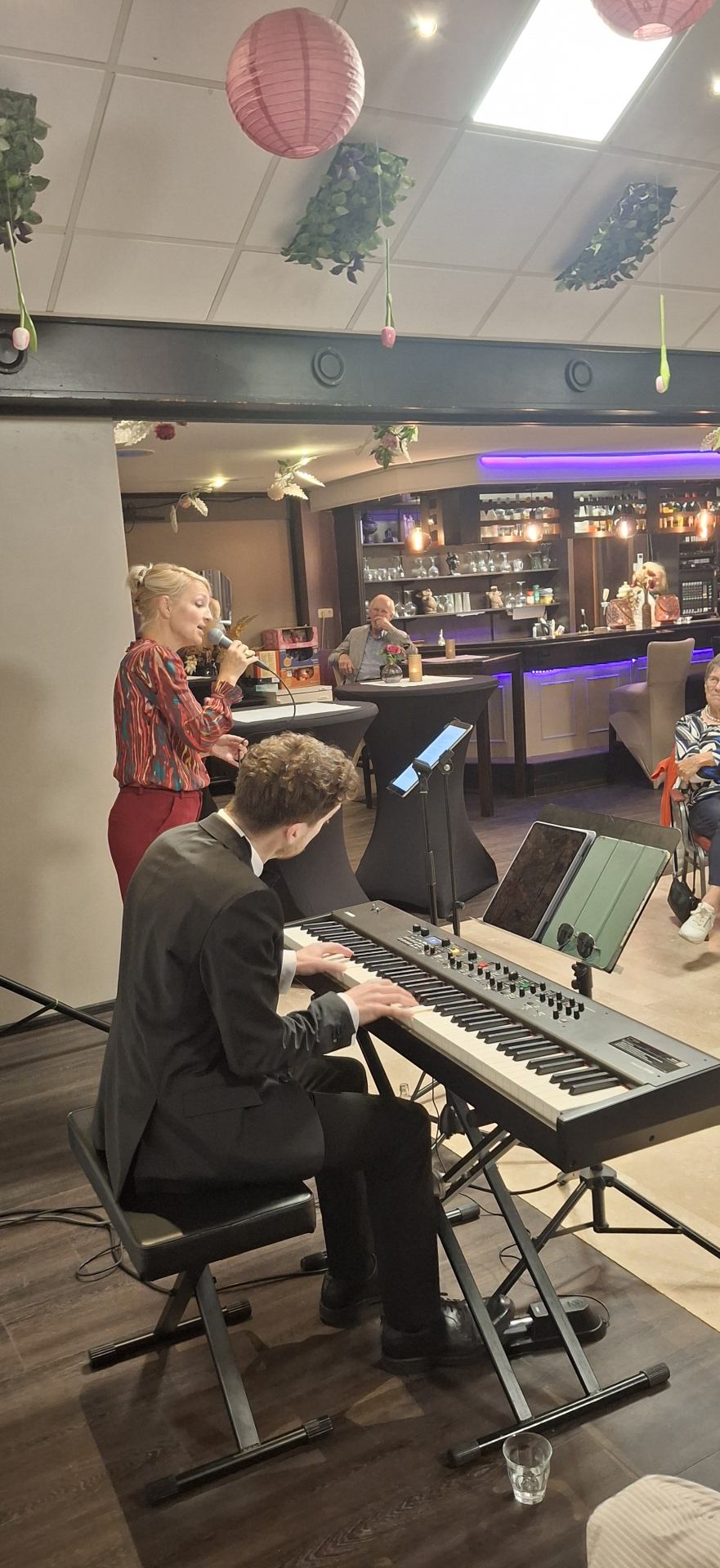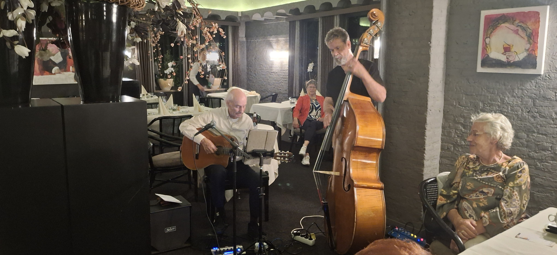 Hier wordt het nagerecht geserveerd en kunnen we gezellig naborrelen en muzikaal verwend worden door bassist Jan Berendsen en gitarist John van Schaijik.